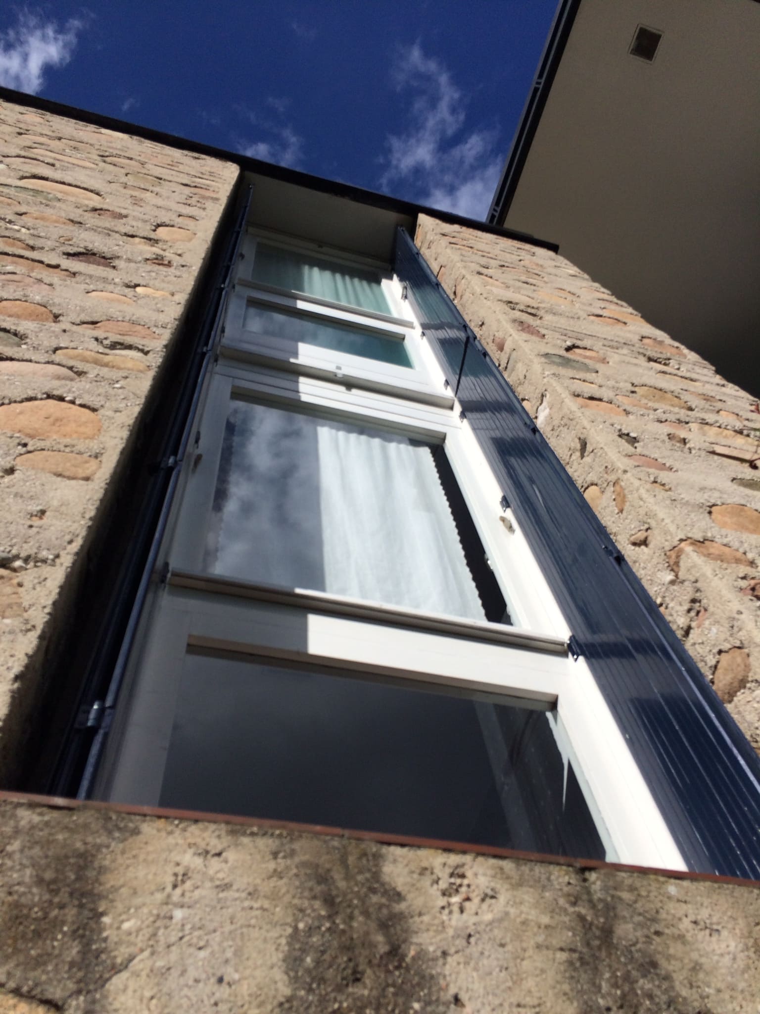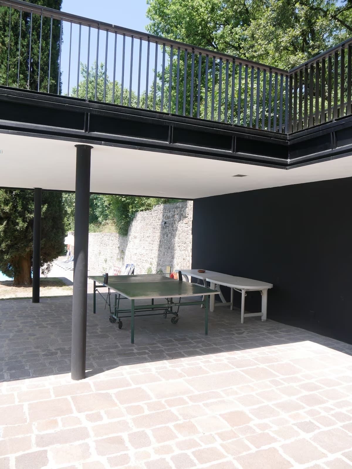 Die Betonmauern mit eingelegten Bruchsteinen sind ein Markenzeichen von Mangiarotti — sie wurden bei allen Häusern und auch im Schwimmbad-Bereich am Fuß des Hügels eingesetzt.